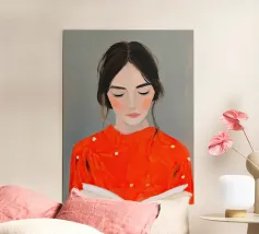 Ein minimalistisches Porträt, das einen stillen Moment der Präsenz und inneren Ruhe einfängt. Weiche Pinselstriche, warme Terrakottatöne und sanfte Kontraste umrahmen eine ruhende Figur, deren Augen in Stille geschlossen sind. Dieses Kunstwerk evoziert Gelassenheit, Selbstbeherrschung und die Schönheit des einfachen Seins. Ein raffiniertes, emotional geerdetes Werk für moderne, skandinavische oder heitere zeitgenössische Innenräume.