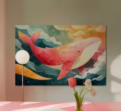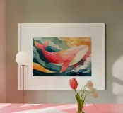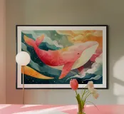 Ein verträumter rosa Wal schwimmt anmutig durch einen magischen Sternenhimmel, umgeben von goldenen Wolken und schimmernden Sternen. Die weiche Aquarelltextur und die sanfte Mischung aus Pastelltönen schaffen eine skurrile, surreale Atmosphäre. Diese bezaubernde Illustration fängt das Gefühl von Wundern, Fantasie und friedlichen Träumen ein und lädt den Betrachter ein, in ein farbenfrohes Universum jenseits der Vorstellungskraft abzutauchen.