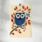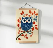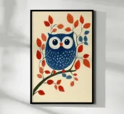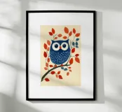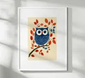 Das Bild zeigt eine stilisierte blaue Eule mit großen, runden Augen, die auf einem Ast sitzt. Die Eule ist mit weißen, federartigen Mustern verziert, während der Ast von roten und blauen Blättern geschmückt ist. Der Hintergrund ist in einem sanften Creme-Ton gehalten, was die kräftigen Farben der Eule und Blätter besonders hervorhebt. Der Stil ist verspielt und grafisch, mit klaren Formen und einem charmanten, fast märchenhaften Charakter.