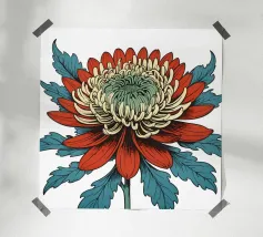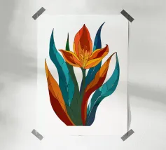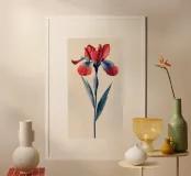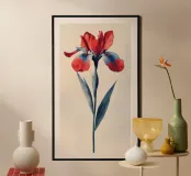 Eine wunderschön detaillierte Illustration einer roten und blauen Irisblüte auf hellem Hintergrund, mit leuchtenden Blütenblättern und weichen, natürlichen Farbverläufen. Der anmutige Stiel und die Blätter verstärken den künstlerischen Reiz.