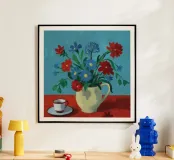 Ein einfaches, klassisches Stillleben mit einem Strauß leuchtend roter Mohnblumen in einem sauberen weißen Krug. Die Komposition ist zeitlos, elegant und hat einen schönen, rustikalen Charme vor einem blaugrünen Hintergrund.