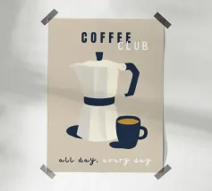 Schwarz-weiße Illustration mit Moka-Kanne, Bohnen und Schriftzug „Caffè?“. Cleanes Design mit Retro-Note, perfekt für Kaffeeliebhaber*innen und moderne Küchenwände.