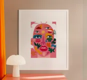 Ein lebhaftes, surrealistisches Porträt eines Gesichts wird in ein Kaleidoskop der Sinne zerlegt, mit mehreren Augen, Lippen und abstrakten Formen. Dieses maximalistische Werk ist eine kraftvolle und energiegeladene Erkundung von Wahrnehmung, Identität und der überwältigenden Natur der Sinneserfahrung.