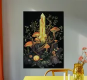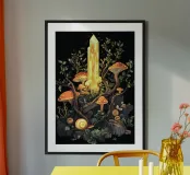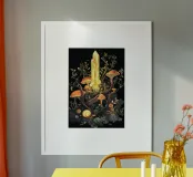 Ein großer, goldener Kristall ragt aus einer Szenerie voller Pilze, Schnecken und Pflanzen empor. Umgeben von orangefarbenen Fliegenpilzen und knorrigem Geäst entsteht ein magischer Ort voller Licht und Leben. Feine Details machen das Motiv zu einem Highlight der Goblincore-Ästhetik.