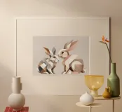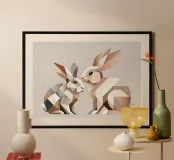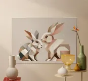 Zwei Hasen in sanften, geometrischen Formen und beruhigenden Erdtönen. Ihre Darstellung in verschiedenen Brauntönen bringt eine verspielte und dennoch elegante Note. Ein perfektes Kunstwerk, das Frühlingsstimmung und die Freude der Saison verkörpert. Geometrische Darstellung von zwei Hasen Harmonische Erdtöne in Beige, Braun und Weiß Ideal für Frühlingsthemen und Osterdekoration Modernes Design mit einem minimalistischen Touch Perfekt für Kunstliebhaber, die kreative Tierdarstellungen schätzen