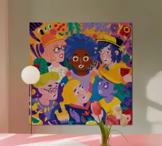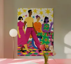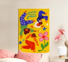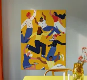 Dieses farbenfrohe, moderne Holzrahmen-Bild von Tamsen Design zeigt eine fröhliche Gruppe von Freunden in Aktion, perfekt für Wohnzimmer, Jugendzimmer oder Gemeinschaftsräume. Die lebendigen Farben und das dynamische Design bringen Leben in jeden Raum und setzen ein optimistisches Statement. Ein wunderbares Geschenk für Freunde oder einen besonderen Anlass.