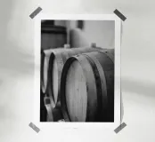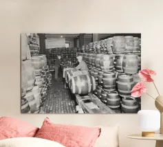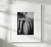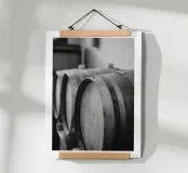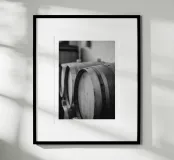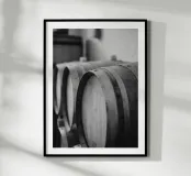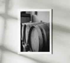 Schwarz-Weiß-Poster einer Reihe von Eichenfässern im Keller: Dauben, Metallumreifungen und Holzmaserung zeigen sich in einem weichen Licht mit einer Tiefenschärfe, die zum Verkosten einlädt. Dieses Foto feiert das Terroir, die Handwerkskunst und die Geduld des Weinausbaus. Ideal für Küche, Esszimmer, Weinkeller oder Weinstube, verleiht es einer zeitgenössischen, industriellen oder rustikal-schicken Dekoration Charakter, Wärme und Authentizität.