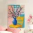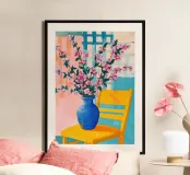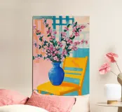 Ein Gouache-Gemälde mit rosafarbenen Kirschblüten in einer blauen Vase auf einem gelben Stuhl, mit einem hellen pastellfarbenen Hintergrund in Pfirsich- und Tealfarben und kräftigen Pinselstrichen. Der Stil ist von den Arbeiten von Henri Matisse inspiriert.