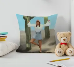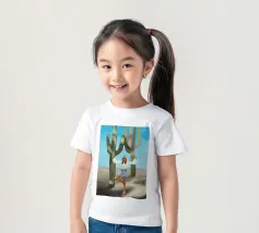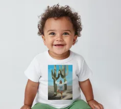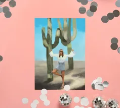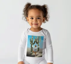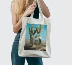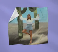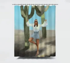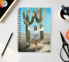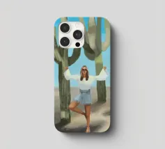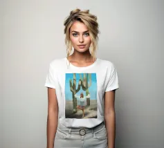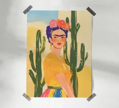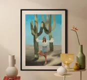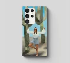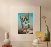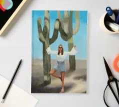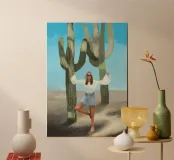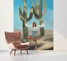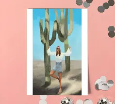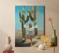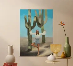 Ein kühnes, modernes Porträt einer selbstbewussten Frau, die in einer sonnenüberfluteten Wüste eine kraftvolle Pose einnimmt, eingerahmt von hoch aufragenden Kakteen unter einem strahlend blauen Himmel. Dieses digital gemalte Kunstwerk vereint Mode, Natur und Haltung und zelebriert die Widerstandsfähigkeit und die Stärke des freien Geistes. Ideal für südwestliche Interieurs, Dekorationen zum Thema Selbstbestimmung oder als auffallendes Geschenk für wilde, abenteuerlustige Seelen.