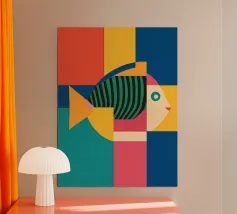 A geometric composition features a stylized orange fish against a backdrop of colored rectangles and circles, blending teal, black, and green shades. Bold shapes and contrasting colors create a modern, abstract aesthetic.