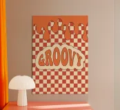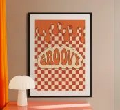 Lassen Sie sich von diesem 70er-Jahre-Ästhetik-Retro-GROOVY-Cloud-Digitaldruck mitreißen. Dieses lebendige grafische Design ist eine perfekte Reminiszenz an den kultigen Stil der 1970er Jahre. Es zeigt das Wort "GROOVY" in fetter orangefarbener Typografie innerhalb einer Wolkenform, gekrönt von schmelzenden orangefarbenen Tropfen, alles vor einem klassischen orangefarbenen und gebrochen weißen karierten Hintergrund. Es ist ein lustiges, retro und auffälliges Stück, das perfekt ist, um Ihrer Einrichtung Vintage-Flair zu verleihen. Diese hochwertige digitale Reproduktion hat eine Auflösung von 7000x5000 Pixeln bei 300 dpi, was eine hervorragende Klarheit, scharfe Linien und brillante Farben garantiert. Ein ideales