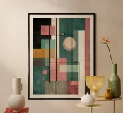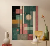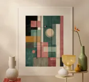 Dieses geometrische, abstrakte Kunstwerk ist ein raffiniertes Zusammenspiel von Form und Gleichgewicht. Es kombiniert gedämpfte Petrol-, Rosé-, Senf- und Cremetöne, um ein Gefühl von ruhiger Struktur und moderner Eleganz zu vermitteln. Klare Linien kreuzen sich mit weichen Farbblöcken und bilden eine rhythmische Komposition, die an das Bauhaus-Design erinnert. Ideal für zeitgenössische Innenräume, die eine raffinierte, architektonische Ästhetik suchen.