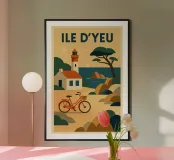 Gönnen Sie sich einen Hauch von Seeluft mit diesem Vintage-Poster von der Île d'Yeu. Zwischen rotem Leuchtturm und weißem Haus, orangefarbenem Fahrrad und Küstenpfad fängt es die Essenz des Sommers auf dem Fahrrad ein, auf einer wilden und beruhigenden Insel. Eine charmante Retro-Illustration, die nach Ausflügen ans Meer, Strandkiefern und pastellfarbenen Himmeln duftet.