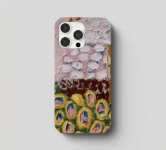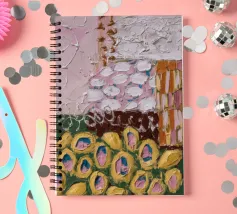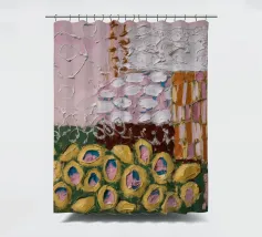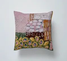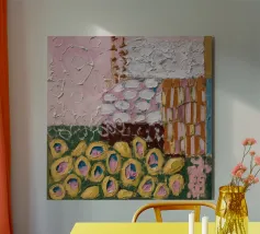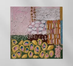 Texturierte kreisförmige und ovale Formen in erdigen Rosa-, Gelb-, Braun- und Weißtönen versammeln sich wie weiche Blütenhügel in diesem taktilen und sanften, abstrakten Muster.