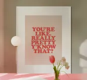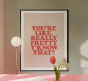 Dieser auffällige Typografie-Kunstdruck zeigt ein verspieltes Kompliment in fetten, roten Buchstaben im Retro-Stil auf einem leuchtend rosa Hintergrund. Dieser Druck ist perfekt geeignet, um jedem Raum einen farbigen und positiven Akzent zu verleihen, und verbindet Vintage-Charme mit moderner Frechheit. Ideal für das Schlafzimmer, die Garderobe oder als liebevolles Geschenk für Freunde. Der hochwertige Druck sorgt für eine lang anhaltende Lebendigkeit und macht ihn zu einem herausragenden Stück in Ihrer Heimdekorationssammlung.