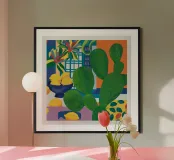 Eine heitere Komposition mit einem großen Topfkaktus und ein paar verstreuten Zitronen auf einem grünen Tisch vor einer gedämpften gelben Wand. Ein blaues Fenstergitter fügt der ruhigen, botanischen Szene ein geometrisches Element hinzu.