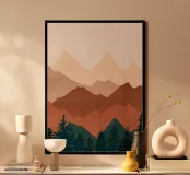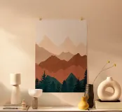 Eine wunderschön minimalistische Berglandschaft bei Sonnenuntergang mit überlagerten Erdtönen und einer ruhigen Waldsilhouette. Diese Kunstwerke sind perfekt, um Wärme und Natur in jeden Raum zu bringen. Als Teil eines zusammenhängenden Sets zeigen die Designs eine ruhige, von Wabi-Sabi inspirierte Ästhetik, ideal für Naturliebhaber und Fans von minimalistischem Dekor