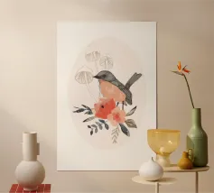 Entdecken Sie den skandinavischen Holzrahmen-Kunstdruck "Nesting" von La Scarlatte, der mit seiner zarten Illustrationen von Vögeln und Blumen eine beruhigende Atmosphäre schafft. Perfekt für das Wohnzimmer, Schlafzimmer oder als Geschenk für Naturliebhaber.
