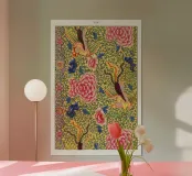 Tauchen Sie Ihren Raum in die opulente Schönheit dieser farbenfrohen "Blumenillustration" von Owen Jones, einem Musterbeispiel aus "Examples of Chinese Ornament", das an die exquisite Nyonya Peranakan-Batik erinnert. Dieser bezaubernde Druck zeigt einen dichten Wandteppich aus üppigen rosafarbenen Pfingstrosen, tiefblauen Blumen und filigranem grünen Laub, verwoben mit stilisierten phönixähnlichen Vögeln, alles vor einem satten gelben Hintergrund. Eine zarte Blumenbordüre ziert die linke Seite und verleiht dem Bild einen besonderen Charme. Die harmonische Mischung aus Farben und detaillierten Motiven schafft ein visuell beeindruckendes und zeitloses Stück. Unser hochwertiges