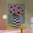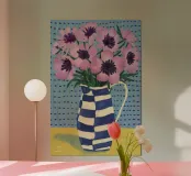 Ein Stillleben mit lila und rosa Mohnblumen in einer blau-weiß gestreiften Vase vor einem gedämpften Hintergrund. Der Stil ist malerisch und modern mit einem Schwerpunkt auf Farbe und Muster.