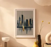 Dieses abstrakte Kunstwerk verwandelt die ikonische Skyline von New York in eine elegante geometrische Komposition. Es spiegelt die Energie der Stadt wider und stellt hoch aufragende Strukturen wie das One World Trade Center und das Chrysler Building scharfen goldenen Akzenten gegenüber. Die Symmetrie der sich spiegelnden Skyline unterhalb des Hauptmotivs verleiht ihm Tiefe, während die gedämpfte graue Farbpalette es modern und elegant erscheinen lässt. Dieses Werk ist perfekt für Liebhaber urbaner Kunst und verkörpert die architektonische Vielfalt und den kreativen Geist von NYC.