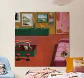 Ein fröhliches Interieur mit einem bequemen rosa Sofa, knallroten Hockern, einem auffälligen Regenbogen-Kunstwerk an der Wand und einem Blick in einen angrenzenden Raum mit grünen Wänden.