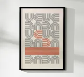 Eine präzise und rhythmische abstrakte Komposition mit einem sich wiederholenden Muster aus stilisierten U-Formen, die aus parallelen Linien bestehen. Das Gesamtdesign erinnert stark an die Ästhetik der Jahrhundertmitte und des Art déco. Das Muster ist in erster Linie in einem gedämpften Grau/Taupe auf einem weichen cremefarbenen Hintergrund gehalten, wird aber durch kühne Segmente in Rostrot dramatisch unterbrochen: eine zentrale, längliche S-Form und ein massiver horizontaler Block aus dünnen roten Linien am unteren Rand. Dieses Poster ist ein hochwertiger digitaler Download (7000x5000 Pixel, 300 dpi), der eine hervorragende Druckqualität und eine beeindruckende visuelle Wirkung für moderne Innenräume gewährleistet.