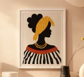 Dieses Bild, "Stolz und Würde", ist ein grafisches Meisterwerk, das mit einer kraftvollen Silhouette eine zeitlose Eleganz feiert. Die klaren, flächigen Formen und die reduzierte Farbpalette erinnern an die expressive Ästhetik des Art-déco und gleichzeitig an die Minimalismus-Bewegung der Mitte des 20. Jahrhunderts. Der Kontrast der strengen schwarz-weißen Streifen mit den warmen, gemusterten Akzenten in Gold und Rot erzeugt eine faszinierende Spannung. Ein ikonisches Statement-Stück, das jeden Raum bereichert.