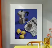 Eine klassische Moka-Kanne, eine Tasse Kaffee, eine Zeitung und Zitronen sind auf einer tiefblauen Fläche angeordnet und bilden eine zeitlose und stimmungsvolle Szene für das morgendliche Kaffeeritual.