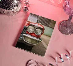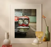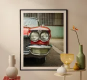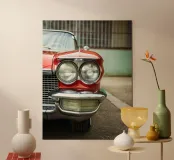 Die Vorderseite dieses klassischen roten Autos besticht durch seine atemberaubenden Details. Die ikonische leuchtend rote Farbe, kombiniert mit dem perfekten Design.