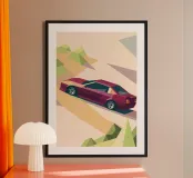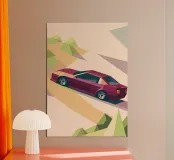 Holen Sie sich eine Illustration eines roten Oldtimer fahren auf einer hügeligen Straße mit einem modernen geometrischen Stil.