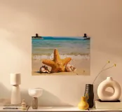 Seesterne und Muscheln an einem sonnigen Strand Poster