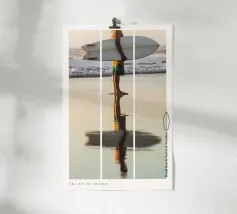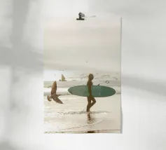 Surfen zur goldenen Stunde: Halten Sie die Magie der goldenen Stunde mit diesem eindrucksvollen Foto eines einsamen Surfers fest, der mit seinem Surfbrett in der Hand über den spiegelglatten Strand von Sagres in Portugal spaziert, der in glühendes Bernsteinlicht getaucht ist. Die dramatische Klippe im Hintergrund reflektiert sanft auf dem nassen Sand und erzeugt einen natürlichen Spiegel, der dem Bild Tiefe und Stille verleiht. Perfekt, um jedem Innenraum eine friedliche, abenteuerliche und warme Note zu verleihen.