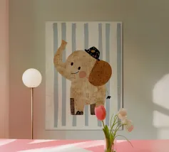Eine skurrile und verspielte Illustration eines minimalistischen Elefanten, der durch gepunktete Texturen und kräftige Farbblöcke zum Leben erweckt wird. Diese charmante Komposition verbindet modernes, flaches Design mit kindlicher Fantasie und eignet sich daher perfekt für Kinderzimmer und stilvolle, eklektische Interieurs. Lassen Sie diese fröhliche kleine Kreatur Farbe und Neugier an Ihre Wand bringen.