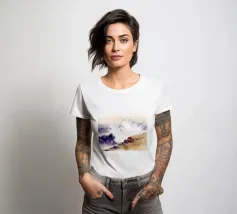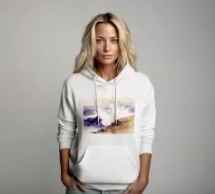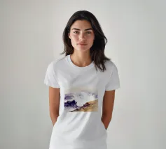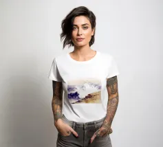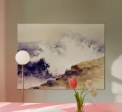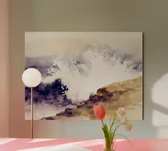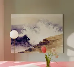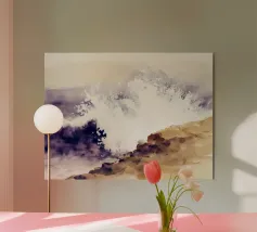 Ausdrucksstarkes Aquarell einer brechenden Welle am felsigen Ufer, das warme Erdtöne mit sanftem Violett zu einer ruhigen und doch dynamischen Küstenszene verbindet.