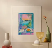 Ein Acrylgemälde zeigt einen Tisch mit Blumen und Orangen vor einem offenen Fenster mit Blick auf das Meer in Frankreich. Vintage-Stil und pastellfarbene Töne wie Lila, Pink, Blau und Grün vermitteln sommerliche Leichtigkeit und entspannte Atmosphäre.