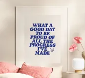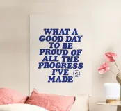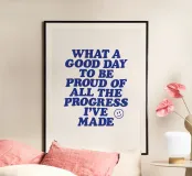 Verschönern Sie Ihren Raum mit diesem retro-inspirierten typografischen Kunstdruck. Mit fetten blauen Großbuchstaben auf einem sanften beigen Hintergrund vermittelt er eine kraftvolle Botschaft der Selbstwertschätzung und des Wachstums. Das charmante Smiley-Gesicht sorgt für einen Hauch von Laune. Dieser Druck eignet sich perfekt für Heimbüros, Schlafzimmer oder Wohnräume und erinnert täglich daran, persönliche Erfolge und Fortschritte zu feiern. Seine Vintage-Ästhetik und die aufmunternde Botschaft machen ihn zu einem idealen Geschenk für Freunde, Familie oder sich selbst.