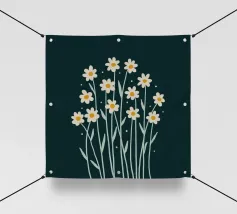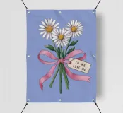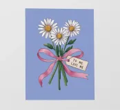 Eine süße und romantische Illustration eines Straußes weißer Gänseblümchen, gebunden mit einem rosa Band. Ein kleines Schildchen mit der Aufschrift "Für meine Liebe" ist angebracht und macht dies zu einer perfekten Darstellung einer herzlichen, romantischen Geste.