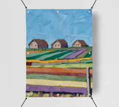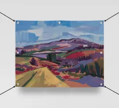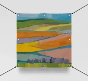 Ein malerischer Blick auf hügelige Patchwork-Felder, die in kräftigen Pastelltönen gehalten sind und eine traumhafte Landschaft schaffen.