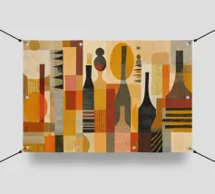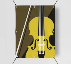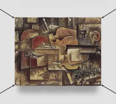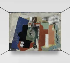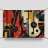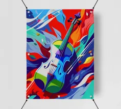Ein modernes abstraktes Gemälde mit geometrischen Formen, die Gitarren, Geigen und Musiknoten in einer kühnen, farbenfrohen Komposition darstellen. Der strukturierte Hintergrund und die dynamische Anordnung wecken ein Gefühl von Rhythmus und künstlerischem Ausdruck.