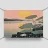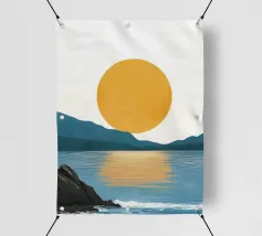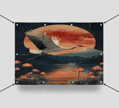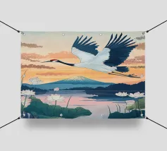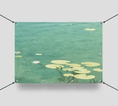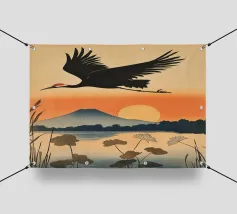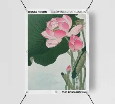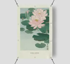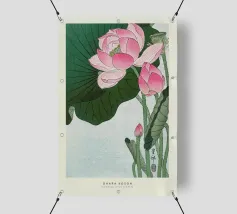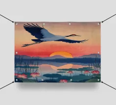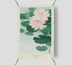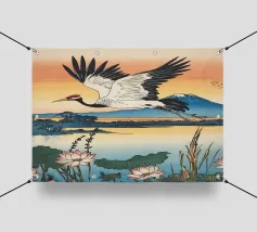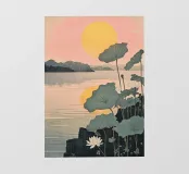 Ein Holzschnitt mit Lotosblättern und Seerosen am Ufer, mit einer untergehenden Sonne in einem zartrosa Himmel über einem ruhigen See. Im Hintergrund ist eine Insel am Horizont zu sehen, umgeben von Bäumen und fernen Bergen. Dieses Kunstwerk verkörpert die Ästhetik der Edo-Zeit und zeigt die Einfachheit der Holzschnitttechniken und der ruhigen Farben.