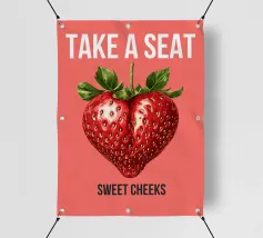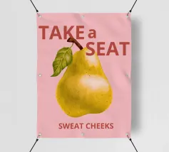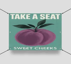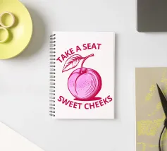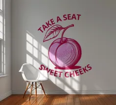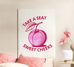 Ein rosafarbener Pfirsich mit einem Blatt steht in der Mitte, umgeben von der verspielten Phrase "Take a Seat Sweet Cheeks". Das minimalistische Design verwendet rosa Schattierungen, um ein lebendiges und humorvolles Bild zu schaffen.