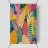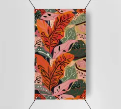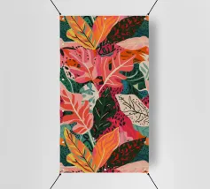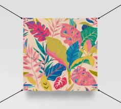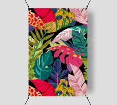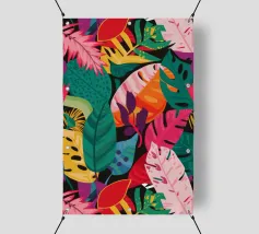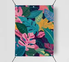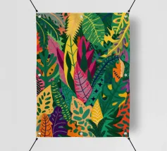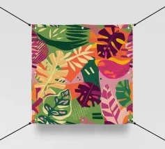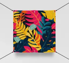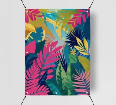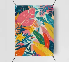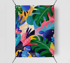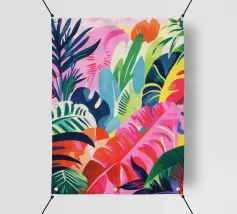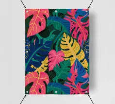 Ein dichtes, farbenfrohes Muster aus sich überlappenden tropischen Blättern und abstrakten Formen in leuchtenden Gelb-, Rosa-, Blau- und Grüntönen, das ein fröhliches, energiegeladenes Design schafft.