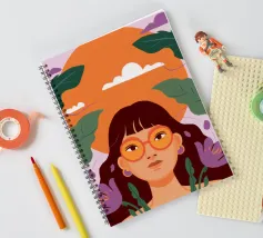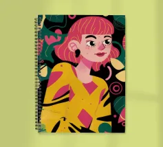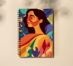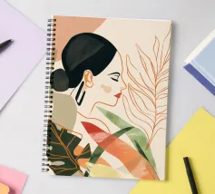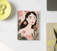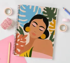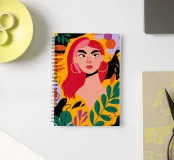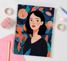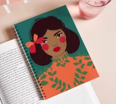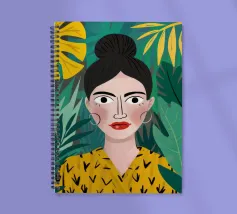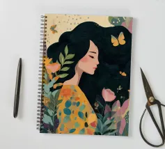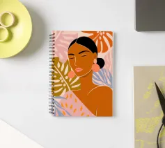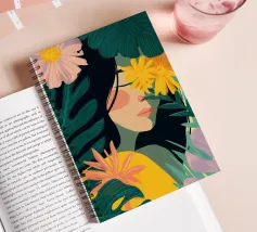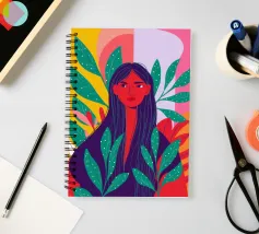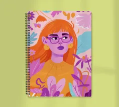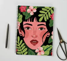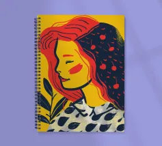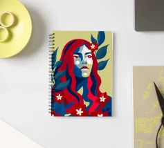 A portrait of a woman with flowing red hair, surrounded by stylized leaves and flowers, looking thoughtfully to the side. The style is modern, bold, and slightly art nouveau.