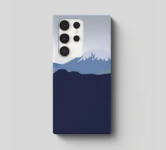 A minimalist depiction shows abstract mountain peaks with mirrored reflections against a soft blue background. The simplistic style emphasizes the jagged edges and serene atmosphere.