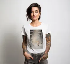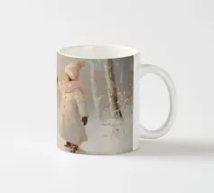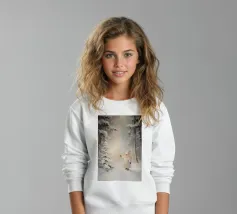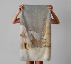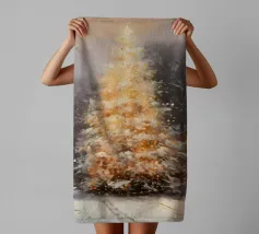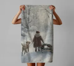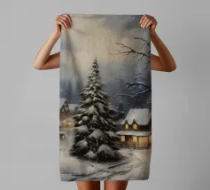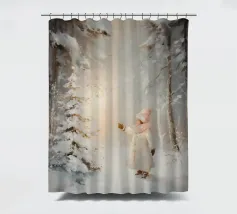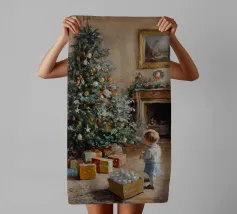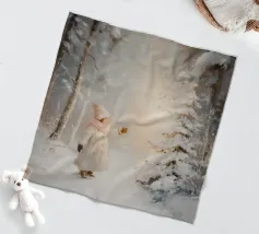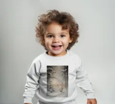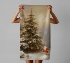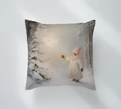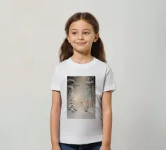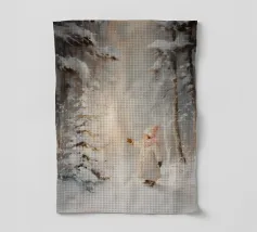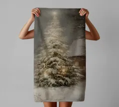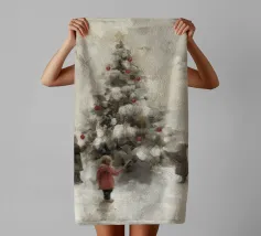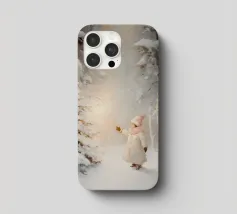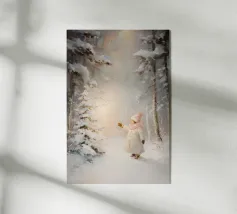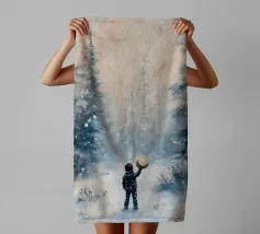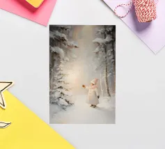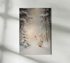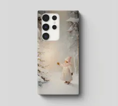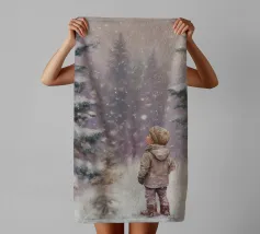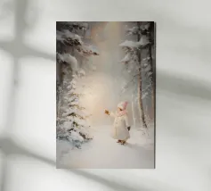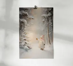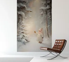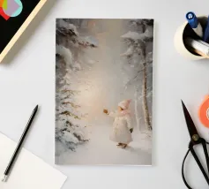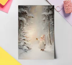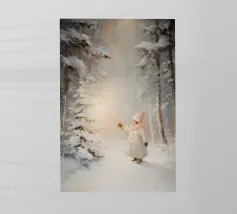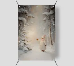 Friedliche Winterszene mit einem Kind in einem weißen Mantel und einem rosa Schal, das sich nach einem kleinen, beleuchteten, schneebedeckten Baum ausstreckt, umgeben von hohen, verschneiten Bäumen.