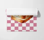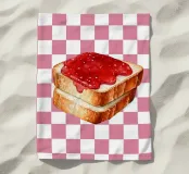 Ein Stapel von drei Toastbrotscheiben mit einer großzügigen Schicht leuchtend roter Marmelade auf der Oberseite befindet sich vor einem rosa und weiß karierten Hintergrund. Die realistische Darstellung des Brotes kontrastiert mit dem verspielten, geometrischen Hintergrund.