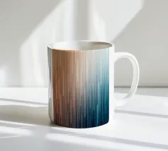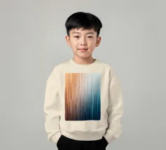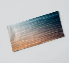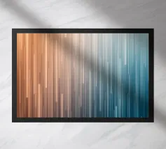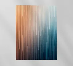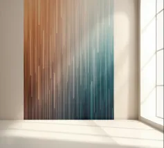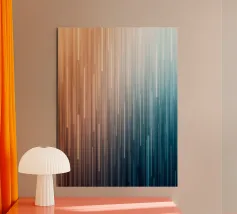 Dieses auffallende abstrakte Werk fängt einen schönen und ruhigen Übergang ein, mit einem sanften Farbverlauf, der von warmen, sonnengeküssten Tönen auf der linken Seite zu kühlen, tiefblauen Tönen auf der rechten Seite übergeht. Die Komposition wird durch eine Reihe von vertikalen Linien bestimmt, die in Länge und Deckkraft variieren und ein Gefühl von dynamischer Bewegung und Fluss erzeugen. Dieses Kunstwerk erweckt ein Gefühl von ruhiger Kontemplation und moderner Eleganz, was es zu einer perfekten Ergänzung für jeden zeitgenössischen Raum macht. Es ist eine visuelle Metapher für die parallele Reise von Tag und Nacht, Wärme und Kühle oder Morgengrauen und Abenddämmerung.