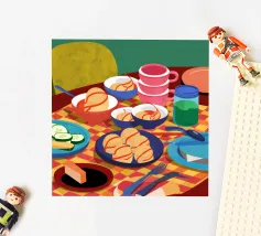 Blick von oben auf einen Tisch mit verschiedenen Brotsorten, Gebäck, Käse und Getränken auf einem karierten Tischtuch. Suggeriert eine rustikale, üppige Mahlzeit.