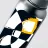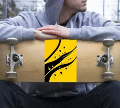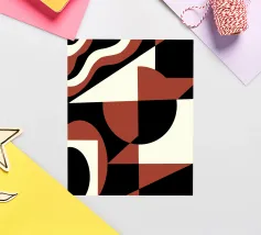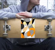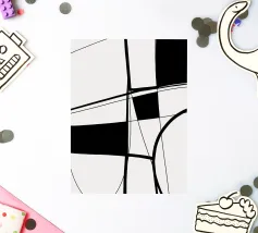 Kräftige geometrische Muster verflechten sich mit einem auffälligen gelben Akzent in einem Design, das den Kontrast betont. Geschwungene und eckige Formen in Schwarz und Weiß erzeugen einen dynamischen visuellen Fluss.